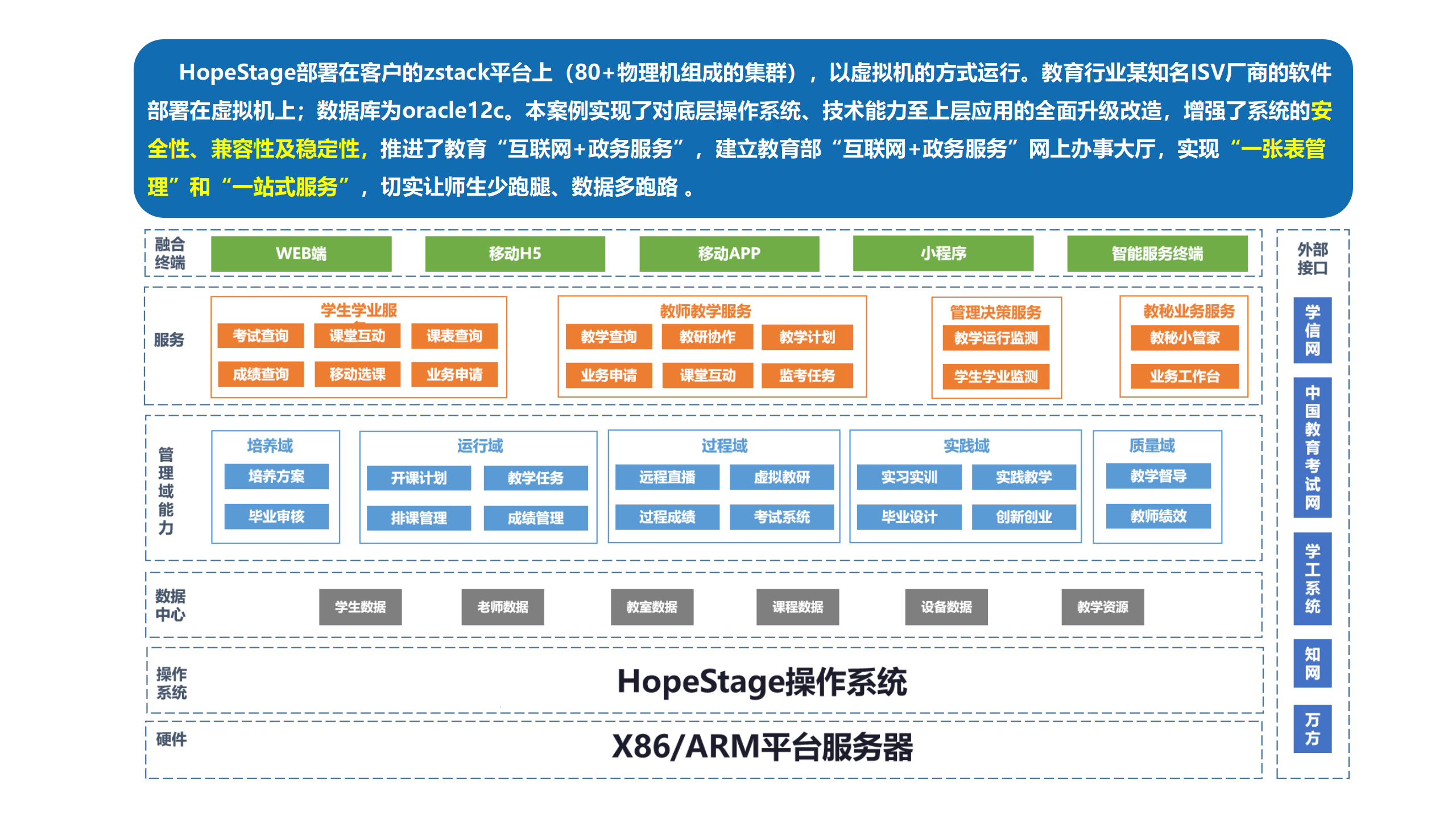 本項目為某高校實現了對底層操作系統、技術能力至上層應用的全面升級改造,增強了系統的安全性、兼容性及穩定性,推進了教育“互聯網+政務服務”,建立教育部“互聯網+政務服務”網上辦事大廳。