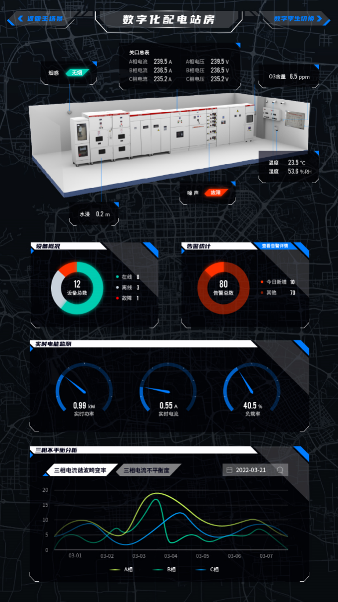 實現數字化配電房的可視化呈現,將實驗室展板的配電房設備拓撲以三維的方式呈現。