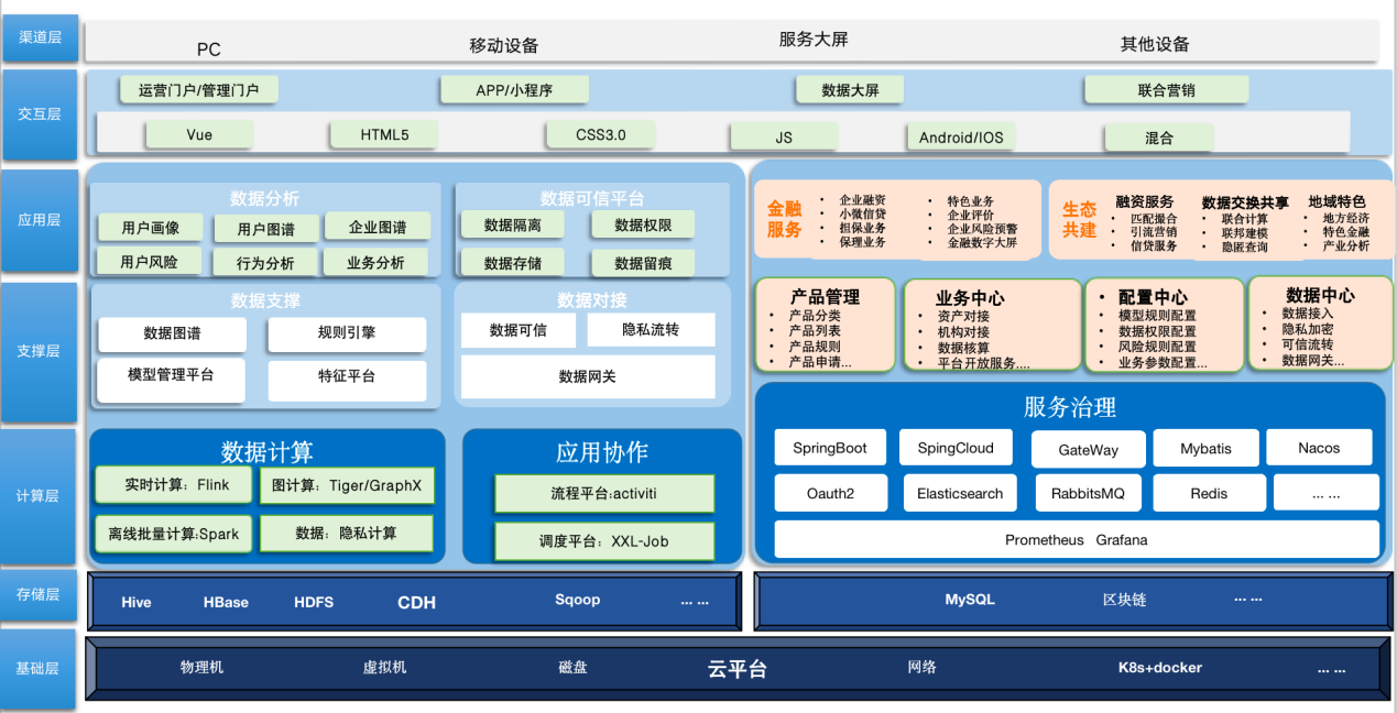 平臺結合互聯網金融的特點,包含PC、小程序、H5等多種渠道,極大地滿足客戶多樣化運營的需求,滿足”集中管理,多端運行“設計原則。通過產品中心、接入中心夠能便捷實現資產接入與產品管理。接入中心可以對接多方、多樣的數據源,通過數據網關、隱私計算,基于數據不出域的原則實現多方共享,同時解決數據安全問題。