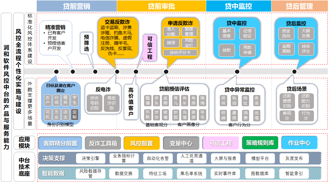 潤(rùn)和軟件為銀行量身打造信貸智能風(fēng)控解決方案,貫穿貸前至貸后全流程,確保風(fēng)險(xiǎn)全面受控。基于強(qiáng)大的中臺(tái)技術(shù)底座,我們提供靈活且高效的智能數(shù)據(jù)支持及決策平臺(tái),輕松與客戶現(xiàn)有科技體系融合,為業(yè)務(wù)升級(jí)提供持續(xù)動(dòng)力。開(kāi)箱即用的應(yīng)用模塊,如客群細(xì)分、反欺詐工具等,均經(jīng)過(guò)深度抽象,實(shí)用性極強(qiáng),支持快速部署。潤(rùn)和還助力建設(shè)標(biāo)準(zhǔn)化的風(fēng)控體系,從精準(zhǔn)營(yíng)銷到貸后監(jiān)控,全方位打造定制化風(fēng)控模型。更引入豐富的高價(jià)值外部數(shù)據(jù)與模型接口,結(jié)合專業(yè)第三方數(shù)據(jù),為銀行信貸安全構(gòu)筑堅(jiān)實(shí)屏障。